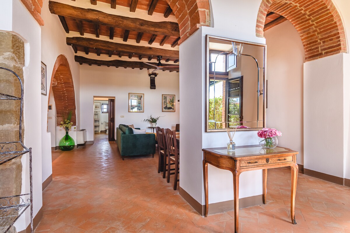 Feel close to the land in a rustic building on a Tuscan farm. Old stone walls, ceilings with exposed beams and terracotta floors are the backdrop to a characteristic apartment with fireplace. Plunge into an infinity pool for a unique view of the surrounding landscape. Dine outdoors, with the fresh air caressing you, sit and relax admiring the sunset under the ancient cypresses.