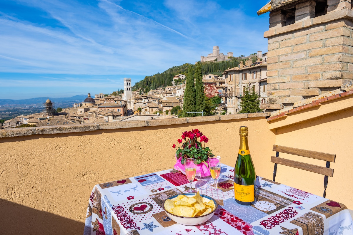 Apartamento con terraza en Asís, con impresionantes vistas de la basílica de Santa Chiara y de todo el valle. Ideal para una estancia tranquila. A 100 metros del estacionamiento Matteotti, punto de parada para el AUTOBÚS que viene de la estación y el taxi, también hay estacionamiento gratuito a 5 minutos del apartamento. El departamento incluye cocina y sala de estar con CAMA MATRIMONIAL tamaño king. Adecuado para parejas que buscan privacidad y relax. También ofrecemos a nuestros huéspedes una cata de vinos gratuita en la tienda de vinos Stelvietti.