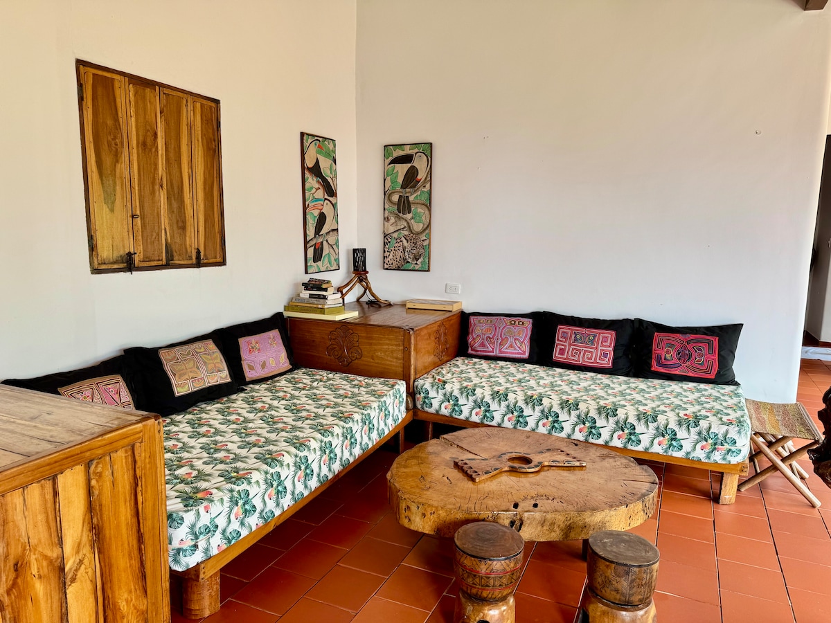Pretty house 66m2 part of Mundo Nuevo Eco Lodge with spectaculars views over the valley, the indigenous village of Awindua, the Punta and the cost. Above the Punta (Incredible point of view, designed like a mini Ciudad Perdidad). Features orthopedic queen bed, dressing, exquisite bathroom ,open shower warm water, little space with a spare mattress ,open common area, mini bar and lovely spot to have a drink. For 2 to 3 people, ideal for a couple or close friends. Looking forward welcoming you.