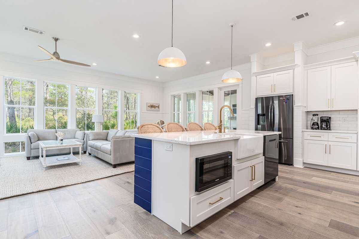 Casa de playa que da a un enorme bosque estatal lleno de rutas de senderismo/ciclismo y vida silvestre. Camina, ve en bicicleta o en carrito de golf de 6 plazas (con cargo adicional) a la playa o sal por la puerta trasera a un increíble bosque de pinos costero. ¡Acceso a la piscina del barrio! Bellamente decorada con todas las comodidades: sala de estar al aire libre con chimenea y porche cerrado, parrilla, bicicletas para adultos y niños y un loft en el tercer piso. Los pueblos 30A de Grayton Beach, Seaside, Alys y Watercolor están a un paseo en bicicleta o a 5 minutos en coche.