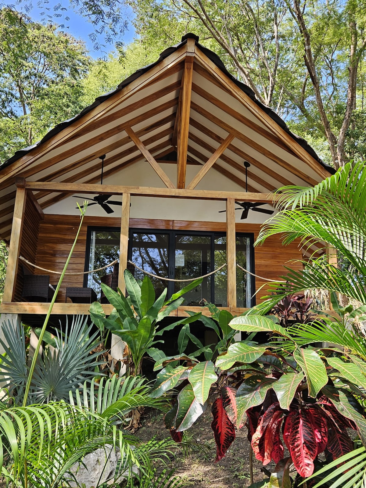 Los bungalows con aire acondicionado Delux están equipados con una cama tamaño king con un colchón ortopédico especial y un colchón de calidad de 1,3 m/2 m, una cocina con refrigerador, congelador y tanque de agua fría, una placa de vitrocerámica, una cafetera. Platos, cubiertos, vasos y copas de vino son una cuestión de rutina. Se proporciona café, sal y azúcar. Televisión y wifi. Toallas de piscina incluidas. El baño tropical al aire libre es simplemente increíble. Están diseñados para un máximo de 5 personas, de las cuales un máximo de 3 adultos. Posibilidad de un gran desayuno por 5000 ₡/persona.