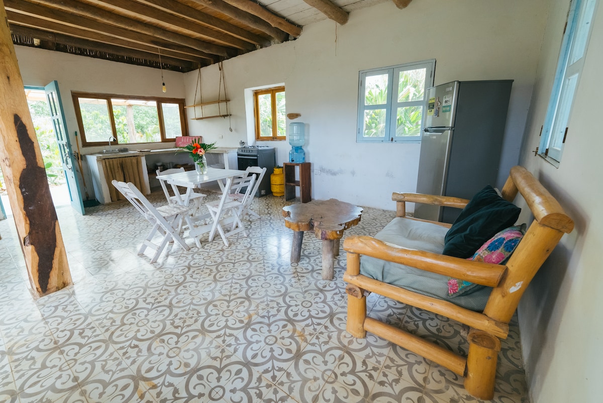 PRIVATE BEACH CABAÑAS (mediterranean style) with its own KITCHEN, FRIDGE and BATHROOM, double bed with an optional extra bed, so perfect for 1 person, a couple or group of 3. Situated 2 min walking to the beach, between SANTANA and POPOYO beach. Walking distance to some of the best surf spots in NICARAGUA. Common area includes POOL, BBQ and hammocks to chill out. We have WIFI, motorbike with racks and surfboards rental, surf guiding service so you can score the best spots in the area.