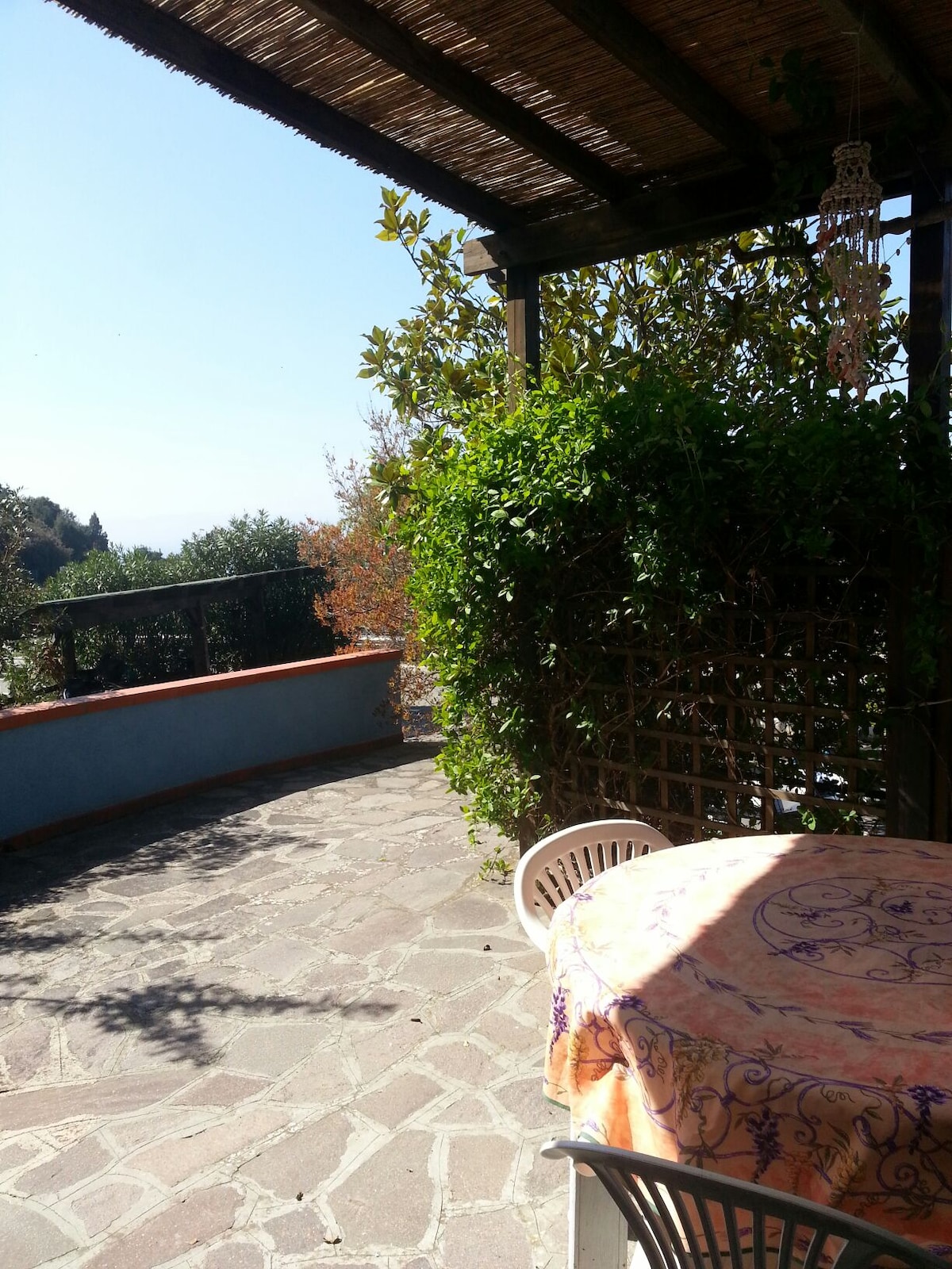 Delizioso appartamento arredato con cura, in stile etnico, provvisto di ogni comfort, in un casolare appena ristrutturato secondo i principi della bioedilizia, immerso nella macchia mediterranea del più bel versante dell'isola d'Elba, con vista mozzafiato sull'arcipelago toscano e sulla Corsica, a 250 m sul livello del mare, dominante la spiaggia di Cavoli. L'appartamento è composto di soggiorno con angolo cottura e divano-letto per due persone, camera matrimoniale e bagno con doccia e ampio spazio esterno attrezzato per pranzare e prendere il sole. Il luogo è raggiungibile con una strada sterrata di 2,5 km dal paesino di San Piero in Campo (fin dove arrivano i mezzi pubblici), distante pochi minuti di macchina dalle spiagge più incantevoli dell'isola (Cavoli, Seccheto, Fetovaia) e dal centro turistico e commerciale di Marina di Campo. E' consigliabile disporre di un mezzo proprio. La casa è immersa nella tipica macchia mediterranea alternata a grandi e suggestive scogliere di granito. Il grande giardino è recintato, contiene un orto e un uliveto. Non vi sono altre abitazioni nei dintorni. Intorno alla località si snodano i più suggestivi sentieri per gli amanti del trekking e della mountain bike. Ideale per chi è in cerca di silenzio, relax, aria pura, e ama la natura e i luoghi un pò speciali. I padroni di casa potranno aiutarvi per ogni evenienza e perplessità. BREATHTAKING VIEW ON THE ARCHIPELAGO Charming apartment,furnished in ethnic style,with every comfort,in an old cottage just renovated according to the bioarchitecture,amidst the Mediterranean bush in the most beautiful part of Elba island with breathtaking views on the Tuscan archipelago and (email hidden) a.s.l.,overlooking famous Cavoli beach. The apartment has a living room with kitchenette and divan bed for two persons,a double bedroom and a bathroom with shower and a large outside patio for eating and sunbathing. You can reach the place through a 2,5 Km dirt road from San Piero in Campo,where pubblic transport ends,and from where ,in few minutes by car you can get to the best beaches of the island (Cavoli,Seccheto,Fetovaia etc.),and to the touristic and service centre of Marina di Campo. It's better to have your own car or motorbike(you can rent it anywhere on the island). The house is surrounded by the typical mediterranean bush scattered with huge granite cliffs. The large garden has an olive grove and a vegetable garden. The place is secluded and there are no other houses in the surroundings. It's an ideal place for trekking and mountain biking and lovers of relax,peace,nature and special places. Your host are ready to help for any need and request.