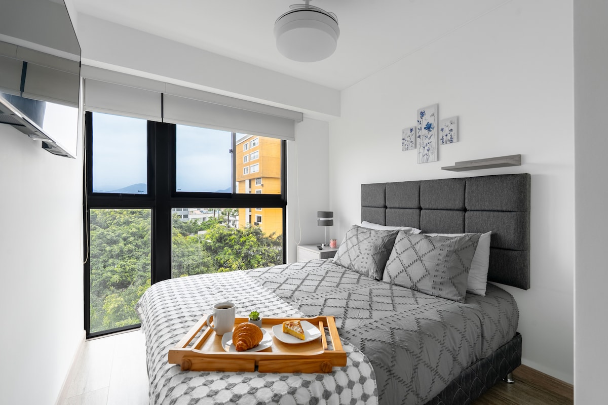 Disfruta una escapada romántica, descansa y trabaja en este espacio tan tranquilo y elegante. Date un relajo en la hermosa y romántica terraza. Contarás con 2 grandes pantallas Smart de 60" y 55" Está ubicado en una zona céntrica y segura. Tienes el Centro Comercial a un paso, el boulevard, restaurantes, gimnasio, Starbucks y la embajada de Estados Unidos a 5 minutos. WI-FI rápido, televisiones con Netflix, Star+, cable , escritorio, cocina y electrodomésticos, seguridad y comodidad