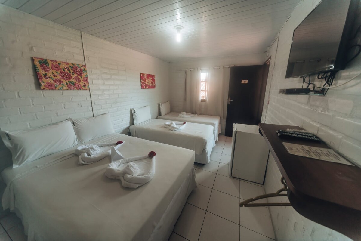 O quarto oferece a opção de uma cama de casal ou uma combinação de uma cama de casal e uma de solteiro. Inclui um banheiro privativo com chuveiro elétrico e toalhas de banho. Está equipado com ar-condicionado, TV e frigobar, proporcionando conforto para duas pessoas.