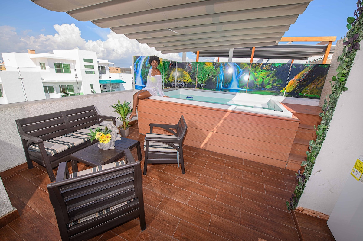 Ven y desconecta en tu oasis privado. Este ático cuenta con 4 dormitorios, 3 baños, cocina totalmente equipada y jacuzzi relajante. Sumérgete en las vistas panorámicas desde la terraza de la azotea. Estamos ubicados en una de las mejores zonas residenciales de Santo Domingo Este. A solo 15 minutos del Aeropuerto Internacional de Las Américas y a 20 minutos de las playas. Muy cerca también encontrarás excelentes restaurantes, bares, supermercados, centros comerciales y farmacias. ¡Reserva ahora para disfrutar de la mejor experiencia dominicana!
