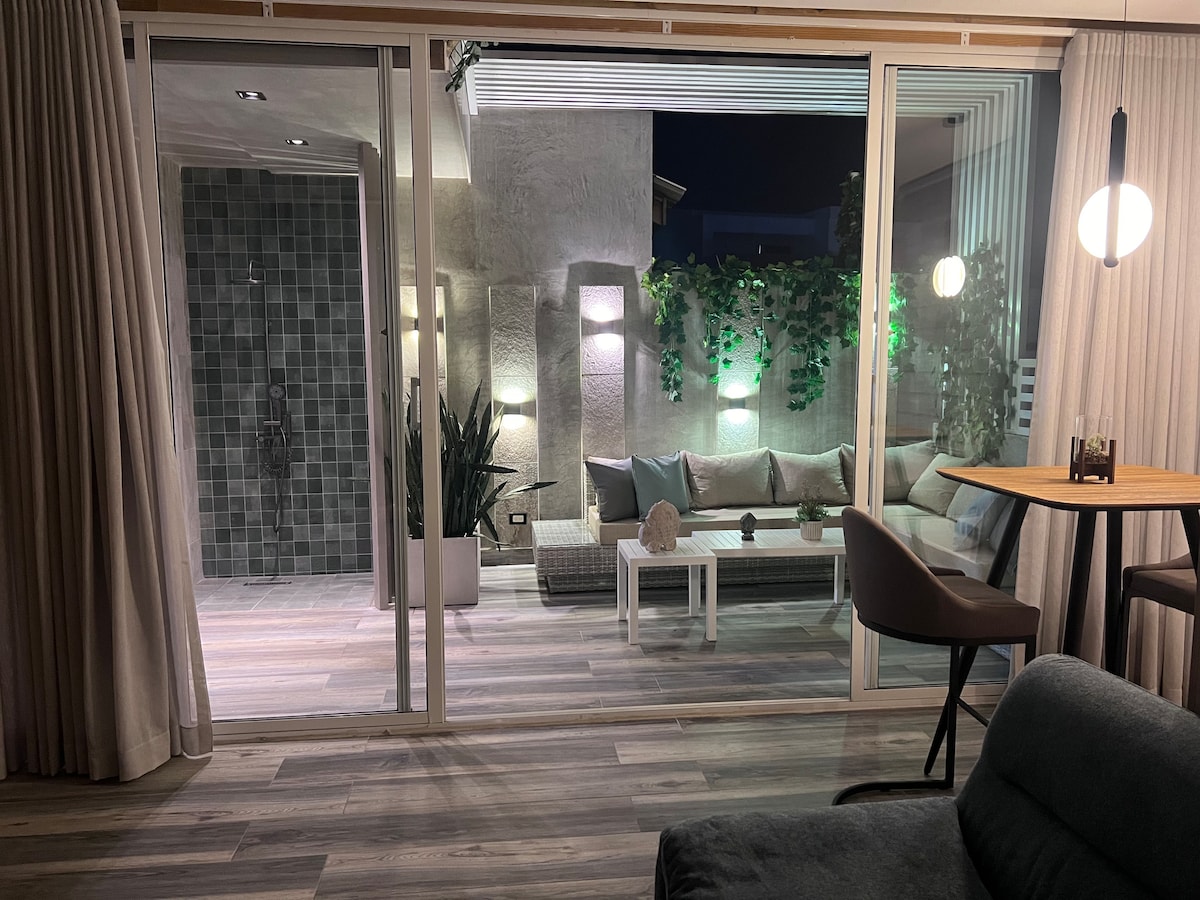 "Descubre la serenidad y el estilo en este alojamiento contemporáneo, ofreciendo un entorno tranquilo y acogedor ideal para relajarse. La sala está equipada con un sofá cómodo y una decoración moderna. Los baño dentro y fuera son un refugio de lujo, con azulejos oscuros y una ducha amplia. Disfruta de la luz natural y las vistas a un tranquilo patio interior, perfecto para un café matutino o una tarde de lectura. Ven y vive una experiencia única en un hogar diseñado con cariño y estilo."