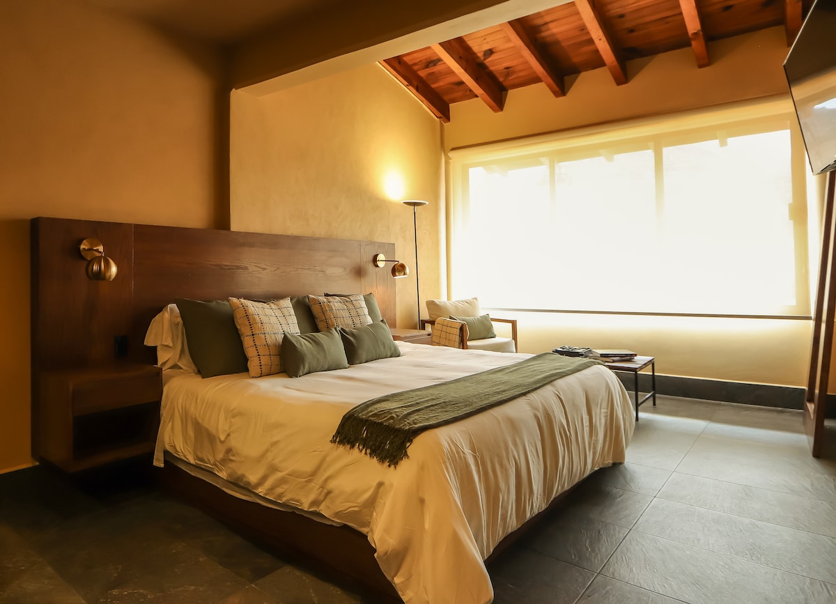 TERMALISMO CÓSMICO: Su hot tub infinito se funde visualmente con el lago de Valle, creando un espejo líquido donde el Nevado de Toluca se refleja al amanecer. Sumérjase en aguas termales mientras las garzas dibujan círculos perfectos en el atardecer. RITUALES: 6:47AM vapor sagrado con rayos sobre volcán. Amanecer de colores. Noche flotación bajo constelaciones. ESPACIOS: Hot tub panorámico, cama king algodón egipcio, terraza privada con sonido de olas. Solicite su ceremonia de aguas eternas.