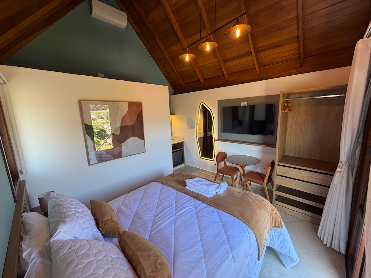 Ubicada en la Ruta del Vino en São Roque, a 3 km de Vinícola Góes, esta cabaña ofrece una experiencia sofisticada y cómoda. El ambiente combina el encanto rústico con las comodidades modernas: 🌡️ Aire acondicionado frío/calor y grifos con agua caliente 📺 TV inteligente 🛏️ Cama tamaño queen con colchón Probel 🍴 Cocina completa 🛁 Jacuzzi interior En el exterior, el paisaje inspira relajación: 🌄 Amplio balcón con vistas panorámicas a las montañas 🔥 Fogata 🌿 Red colgante y hamaca. 🚗 Estacionamiento privado