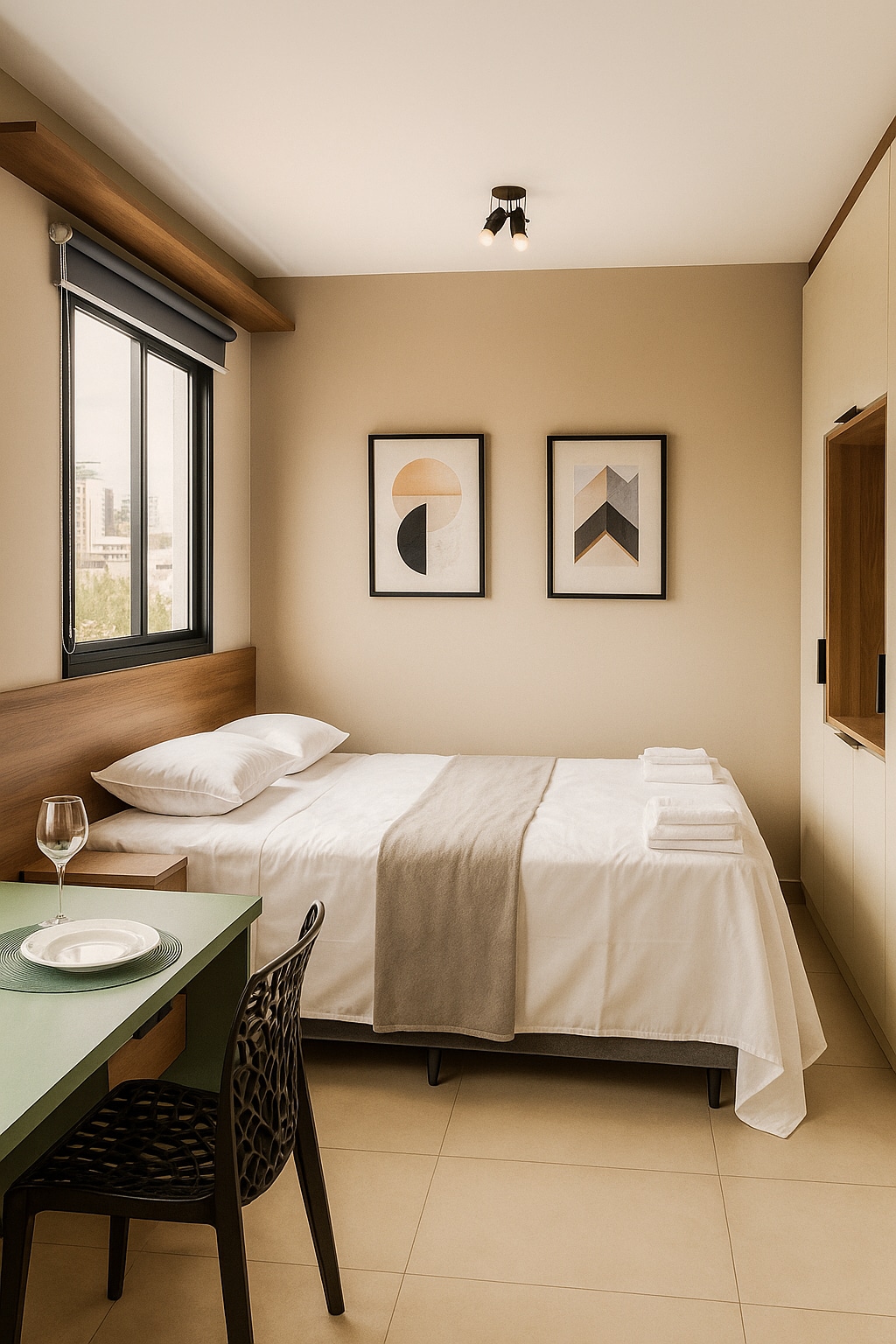 Disfrute de una experiencia memorable en este estudio cerca de USP y UFSCar, rodeado de supermercados, farmacias, bares y panaderías. Cocina compacta completa con utensilios, cafetera, microondas, horno eléctrico; dormitorio con cama box doble; sala de estar con escritorio y sofá cama. Balcón gourmet con barbacoa, mesa, sillas y vistas impresionantes. Importante: proporcionamos ropa de cama por un suplemento. Créanos: nuestro diferencial es la relación calidad-precio. ¡Esperamos que lo disfrute!