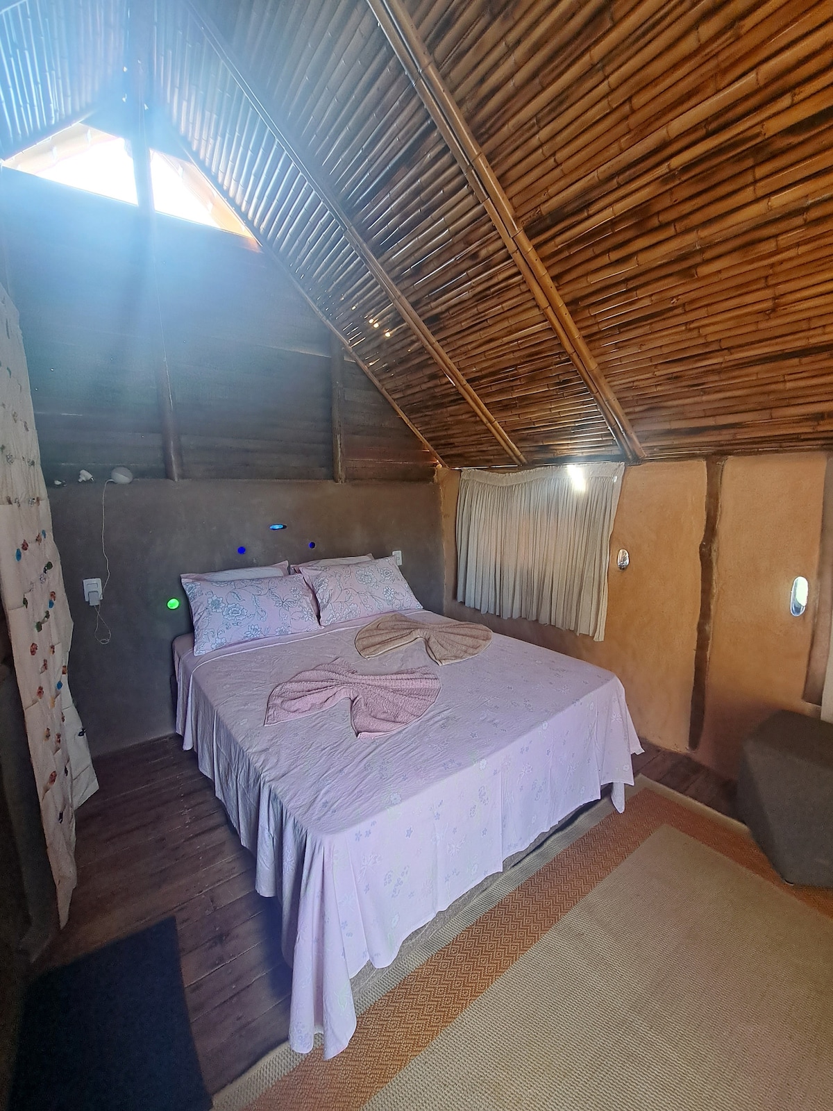 Este lindo chalé de bioconstrucao super confortável, acomoda 01 casal. Localizado em meio a natureza incrível do Tijucal, área rural de Conceição do Mato Dentro, é perfeito para casais que querem tomar um vinho a beira do fogão a lenha e desfrutar deliciosos banhos de cachoeiras localizadas no próprio terreno. Disponíveis também para os hóspedes frutas da época, horta orgânica e ovos caipiras A piscina natural e a cachoeira são comuns aos hóspedes das duas casas disponíveis para alugar.