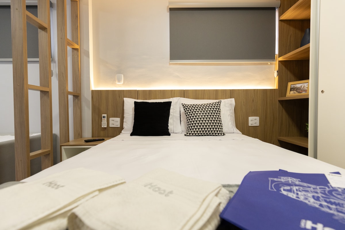 Kitnet funcional y compacto cómodo con 11 m2 en el corazón de São João Del Rei MG. Ideal para hasta dos personas. El departamento ofrece: - WiFi • Televisor inteligente Full HD de 32 pulgadas. • Caja Bicama con colchón adicional. • Ropa de cama - Toallas • Minibar • Microondas - Estufa de inducción • Sandwichera/parrilla - Botella térmica • Cubiertos • Tazas • Taza y plato • Colador de café • Leche • Panela • Ventilador de techo. • Armario colgante - Sillas. • Armario del baño • Espejo • Jabón