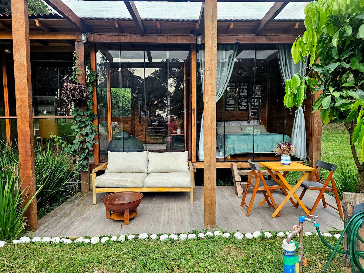 Cabaña de alta gama ubicada en la zona rural de São José dos Pinhais en una propiedad segura, rodeada de naturaleza increíble. * Se incluye una cesta de desayuno proporcional al número de noches, cesta disponible a la llegada. * Relájate en nuestro hidromasaje interno. * Chimenea * Aire acondicionado * Fogata * Cocina totalmente equipada (refrigerador, sándwichera, estufa, horno, microondas, cafetera, ollas y utensilios). * TV inteligente. * Internet. * Calefacción a gas. * Local para 2 personas (+18)
