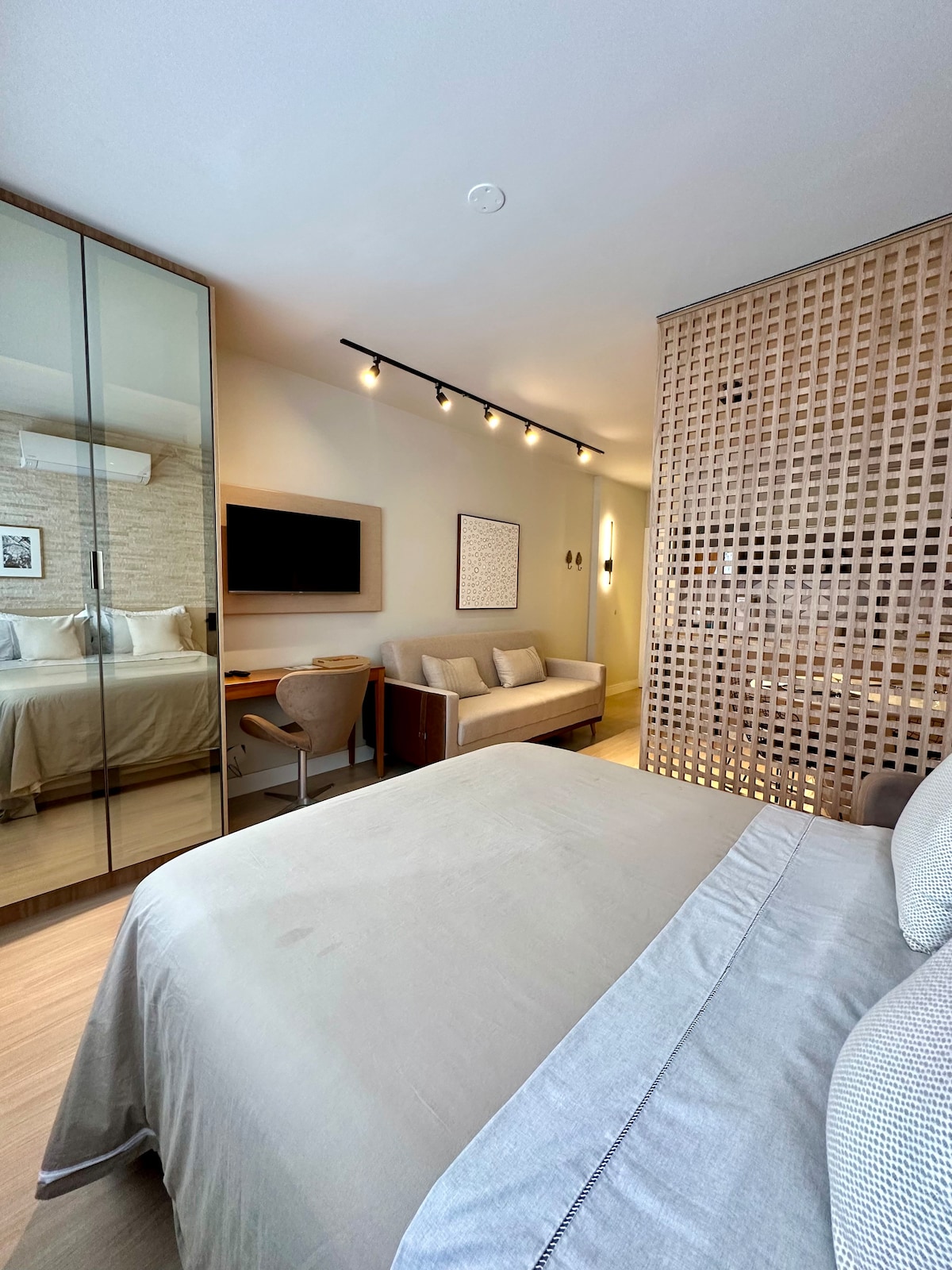 Espaço confortável em estilo industrial preparado pensando no seu conforto. O espaço contém uma cama de casal e um sofá-cama pequeno, mas confortável. Possui também uma mesinha para trabalho. O apartamento é face norte e tem uma ótima iluminação. À noite possui, além de uma iluminação clara para trabalho, opção de luz para um ambiente mais aconchegante. Tomada ao lado da cama com entrada USB. Temos adaptador para tomadas estrangeiras. Televisão smart e WiFi. Cozinha com utensílios essenciais.