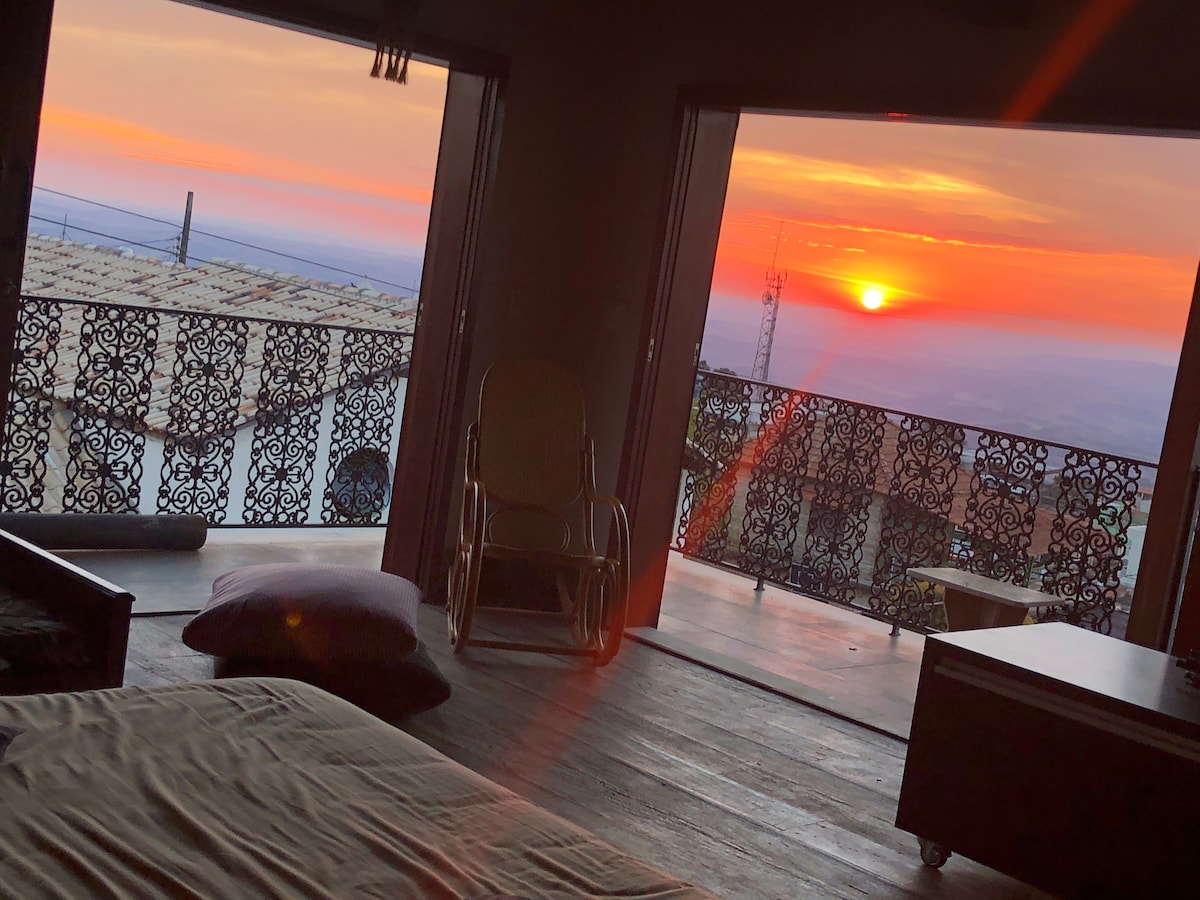 Apartamento completo e privado no centro da cidade. Vista incrível para o pôr do sol. Espaçoso e arejado o loft é ideal para um casal, mas conta com mais dois sofás camas de casal, podendo hospedar até 6 pessoas. Cozinha completa (fogão, geladeira, microondas, Airfryer, sanduicheira e filtro de barro). Wi-fi, Smart TV, roupas de cama e toalhas de banho inclusos. Há 200 metros da praça central. Pets pagam taxa extra. Para hóspedes que chegam no ônibus das 4:30hs hs favor reservar a noite anterior