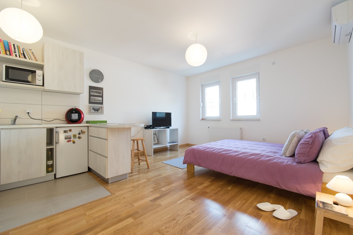 Estudio moderno en el centro con estacionamiento gratuito y jardín