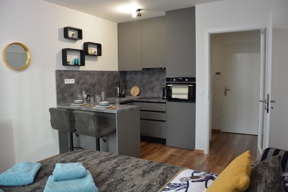 Tu nuevo y elegante apartamento ofrece una estancia cómoda para un máximo de 2 personas. Se encuentra en una nueva urbanización a pocos minutos del centro de la ciudad. El alojamiento está totalmente amueblado (electrodomésticos de cocina, wifi, TV inteligente Antik, etc.) y está listo para tu estancia. Hay aparcamiento gratuito en el espacio subterráneo designado. La seguridad de la propiedad y de los huéspedes la proporciona una empresa de seguridad privada.