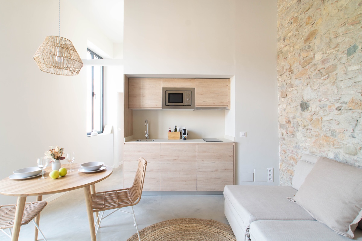 This beautiful duplex has been completely renovated with modern kitchen and a cute little patio and kept it’s eye for detail. The old stone walls, high rounded ceilings give you the feeling you are in the old town of Girona. One of the filming locations of Game of Thrones is just around the corner. A perfect place to call home for a few days and enjoy the old city of Girona.