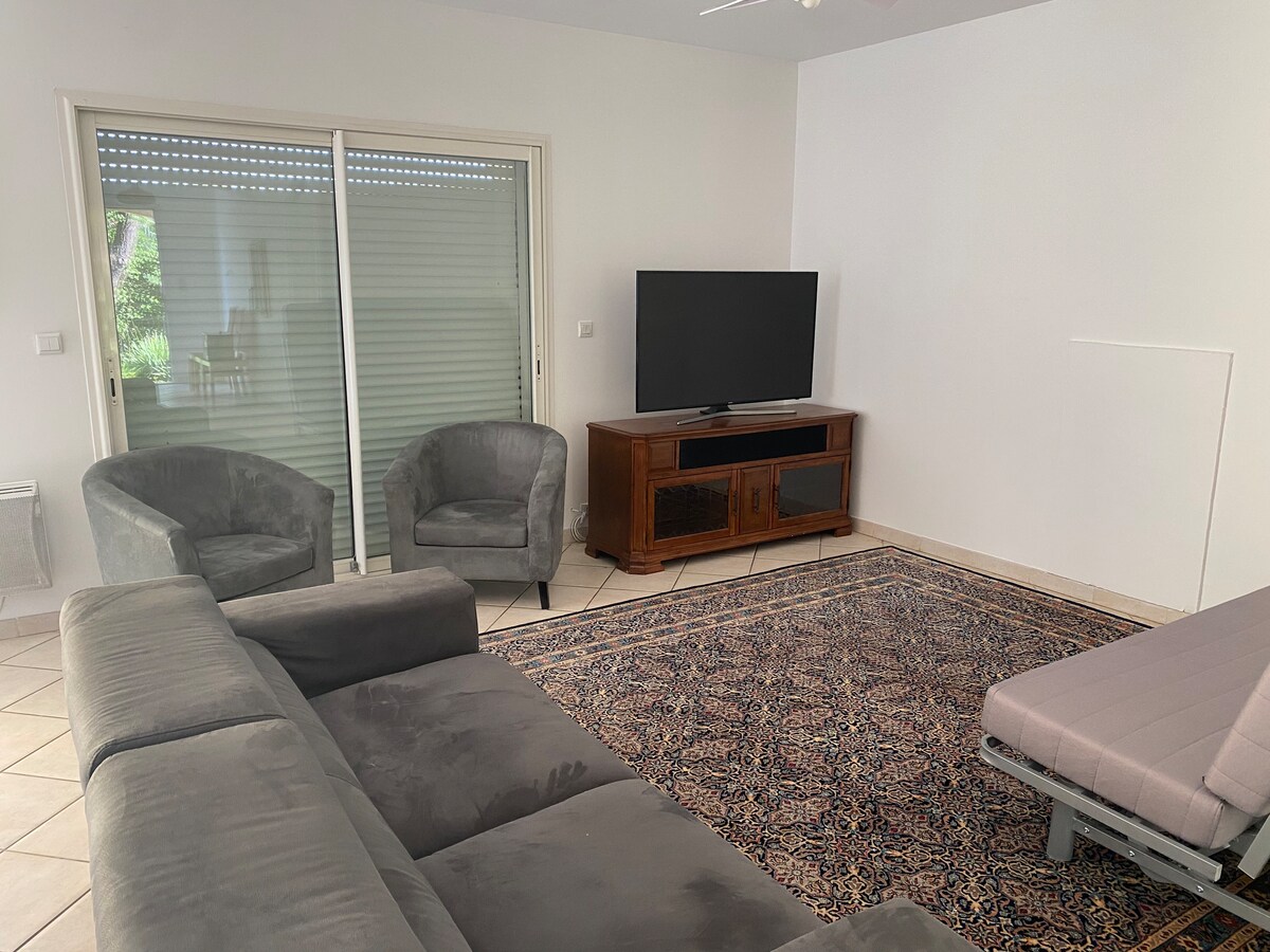 Encantador estudio con cocina y utensilios de cocina, con baño (bañera y ducha e inodoro) situado en la planta baja Acceso independiente. Podrá relajarse en el jardín . Está arbolado y planta mayoritariamente de olivos . Recogemos sus aceitunas para hacer un aceite sabroso. Estacionamiento seguro cerrado en el camino de entrada . Cama de 160 + colchón adicional a petición. Armario de almacenamiento Se proporcionan sábanas y toallas de ducha. Juegos de mesa