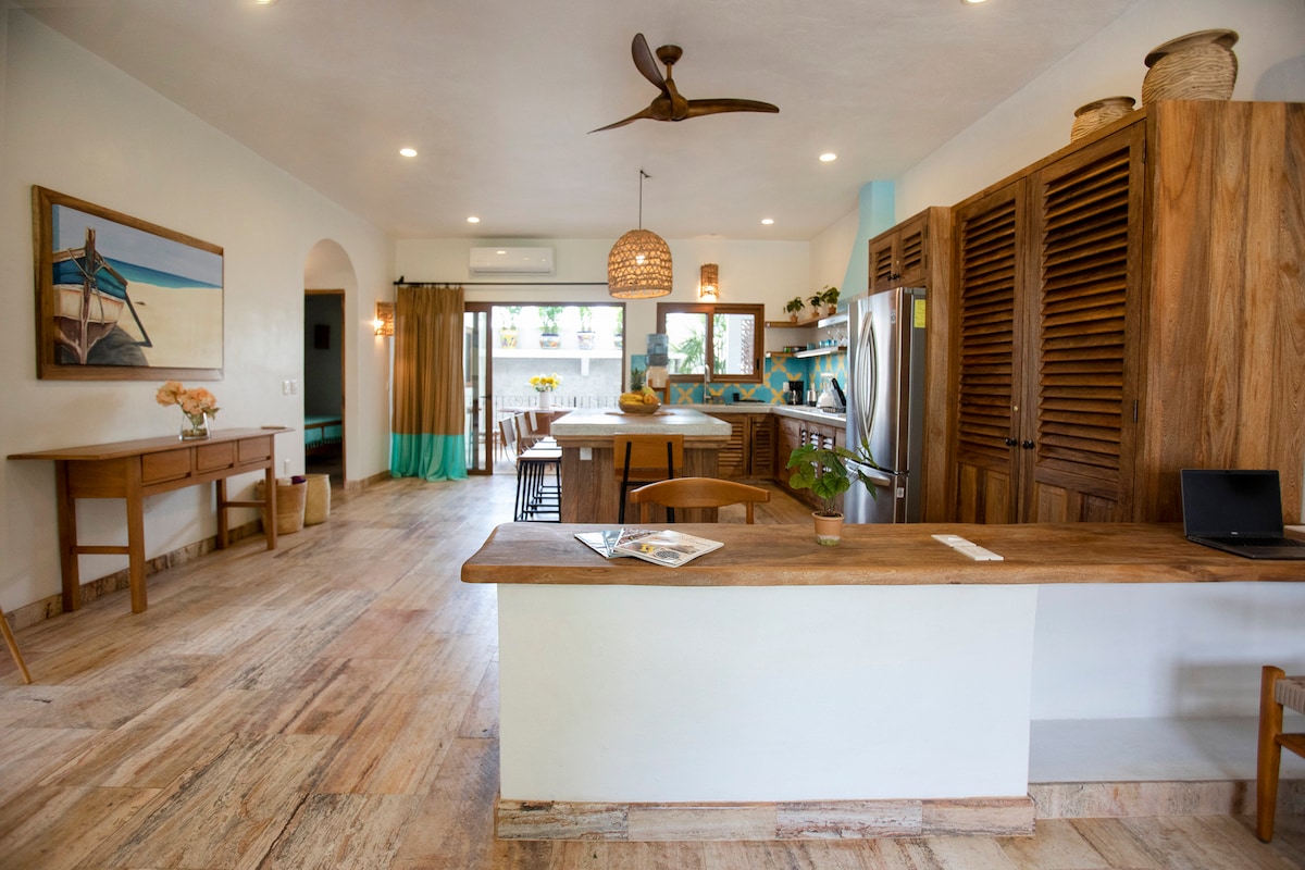 Un condominio con terraza de 3 dormitorios y 3 baños con vista al mar, moderno y totalmente equipado en un exuberante complejo seguro, a 1 cuadra del lado limpio y poco concurrido de la playa de Sayulita. Piscina infinita con vista al mar; wifi de fibra óptica de alta velocidad, la única cancha de tenis en Sayulita; una terraza privada con techo sombreado y cocina al aire libre con vistas a Surfbreak y Monkey Mountain, TV de 65 pulgadas, aire acondicionado, cocina interior, lavadora/secadora, estacionamiento exclusivo, carrito de golf de la casa con estacionamiento en el complejo para alquilar, energía solar, a 3 minutos a pie de la playa y a 10 minutos de la ciudad