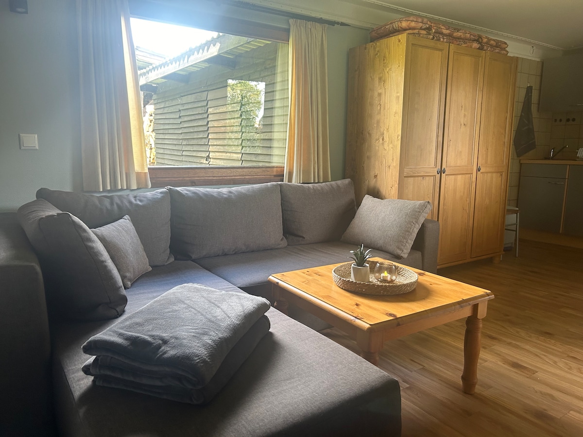 El centro del pueblo con sus tiendas está a poca distancia a pie, en un máximo de 10 minutos. Estudio (aprox. 30 m²) con entrada privada, cama doble (1,40 m), cama individual (0,90 m) y baño privado. Zona de comedor con nevera, hervidor de agua, tostadora, vajilla y cubiertos. Se ruega fumar en el «salón para fumadores» adicional. En el vecindario hay una empresa que puede proporcionar «impresiones acústicas» entre las 7:00 y las 16:30 durante la semana.