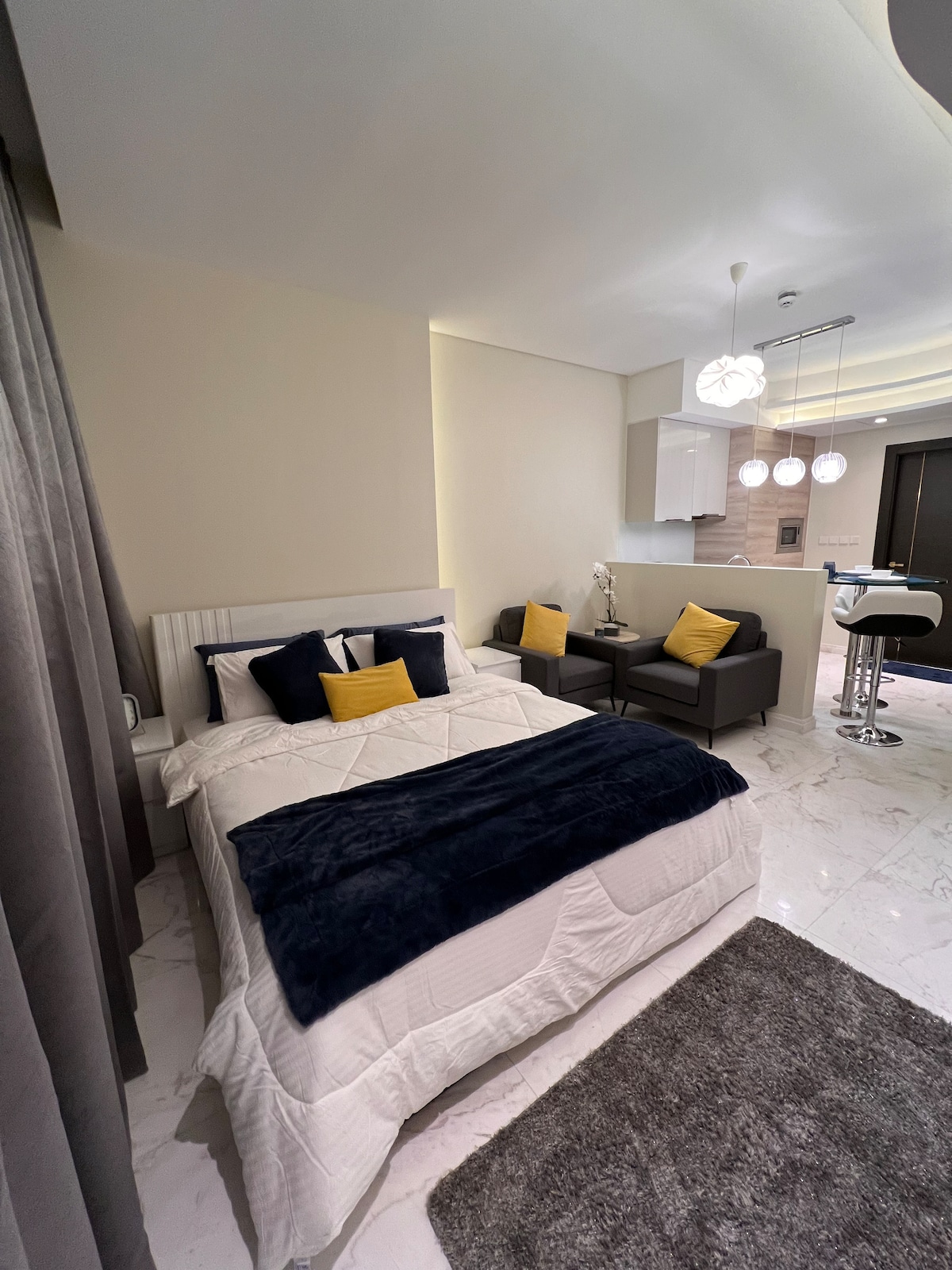 A unique brand-new luxury apartment located at the seafront Buildings of the financial harbor with a partial view of the sea The studio is elegantly furnished with high-end contemporary furniture. Featuring: Open plan lounge Furnished including 65” Tv with Balcony, Dining area, kitchen with German appliances. . Facilities Swimming pool, Gym, private parking, security with 24 hrs reception.