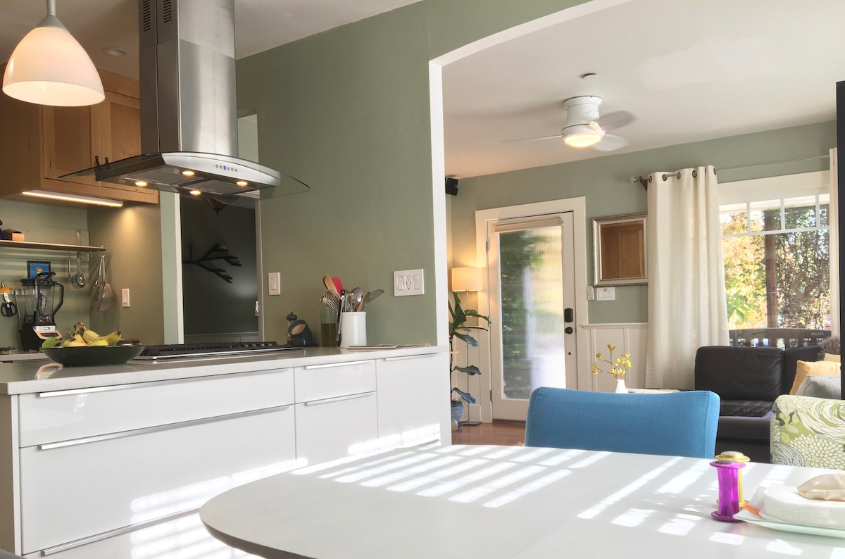 Casa artesanal mejorada en el soleado centro de la ciudad duerme cómodamente dos personas. Disfruta de una cocina equipada con chef, muebles y comodidades de lujo, y un porche ajardinado. Conveniente acceso a playas, senderos, centro de la ciudad, restaurantes, UCSC y todo lo que Santa Cruz tiene para ofrecer. No es apto para huéspedes menores de 12 años. Impuesto sobre el alojamiento en la ciudad 14%. Permiso 18-0191.