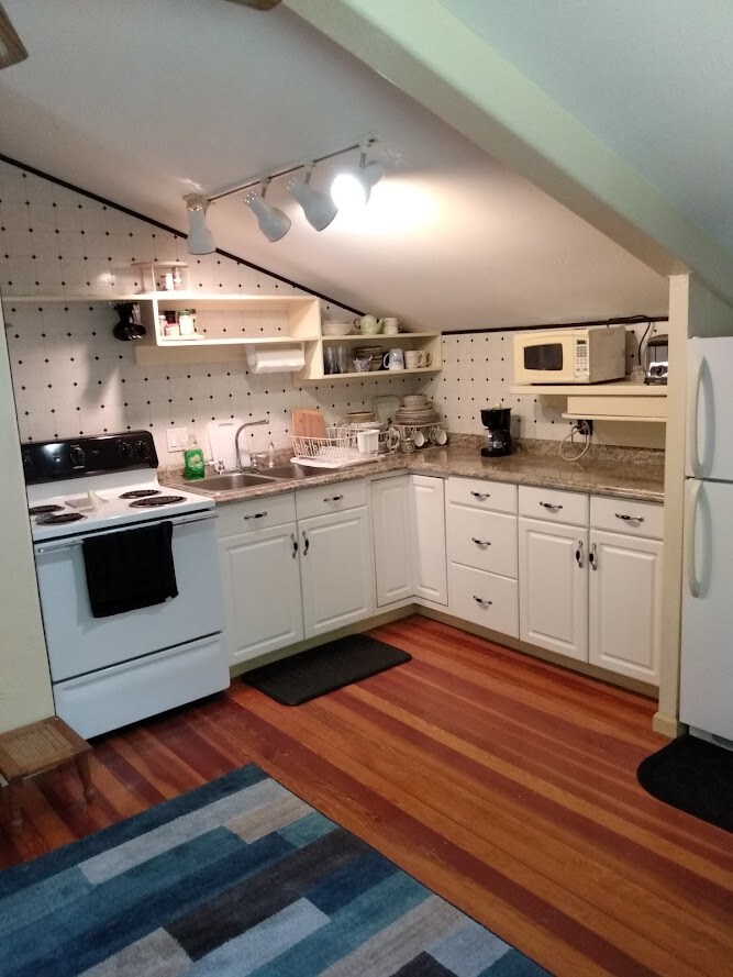 The guesthouse seamlessly blends modern amenities with historic charm in a cozy, compact space. The antique claw foot tub/shower combo offers a charming, yet snug, spot for a relaxing soak—true to its historic roots, the bathroom could be best described as a quaint water closet. After a day of exploring unwind in the patio. Play a favorite record, and savor your coffee while daydreaming about new experiences. Despite its small size, it provides all the modern comforts you need.