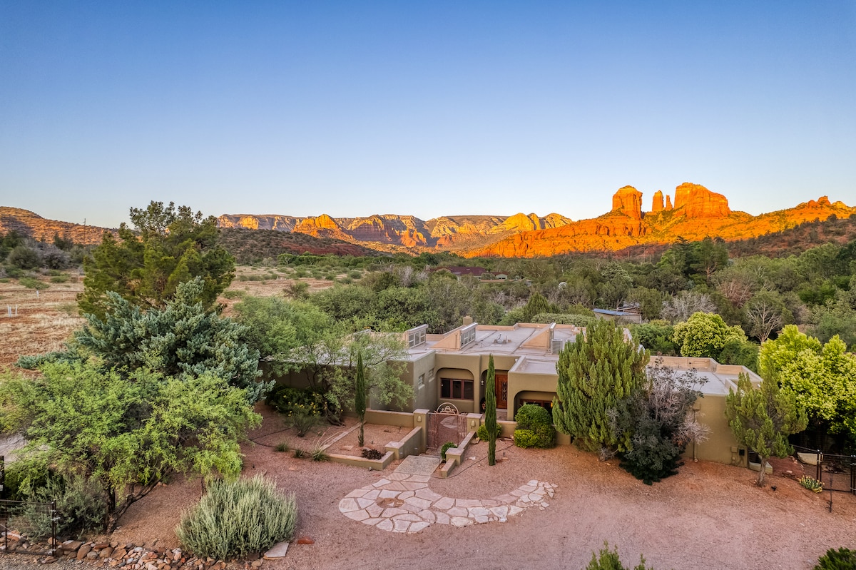 Amplia casa personalizada en la parte alta de la ciudad, (2) suites principales. Vistas a Red Rock desde todas las habitaciones. Jacuzzi, baño de vapor, carga Tesla. WIFI rápido. (2) Comedores, LR con chimenea de gas de piedra, FR con TV inteligente de 85pulgadas, (2) patios cubiertos para disfrutar de las vistas y contemplar las estrellas. Barbacoa de gas, comedor de Al Fresco hasta 8. Entorno tranquilo, enclavado en la belleza natural de Sedona con un corto paseo a <1 milla de cafeterías, restaurantes, excursiones en jeep y tiendas en Uptown. A 1 milla de Tlaquepaque Arts Village, más de 200maravillosas rutas de senderismo, a 2 horas del Gran Cañón.
