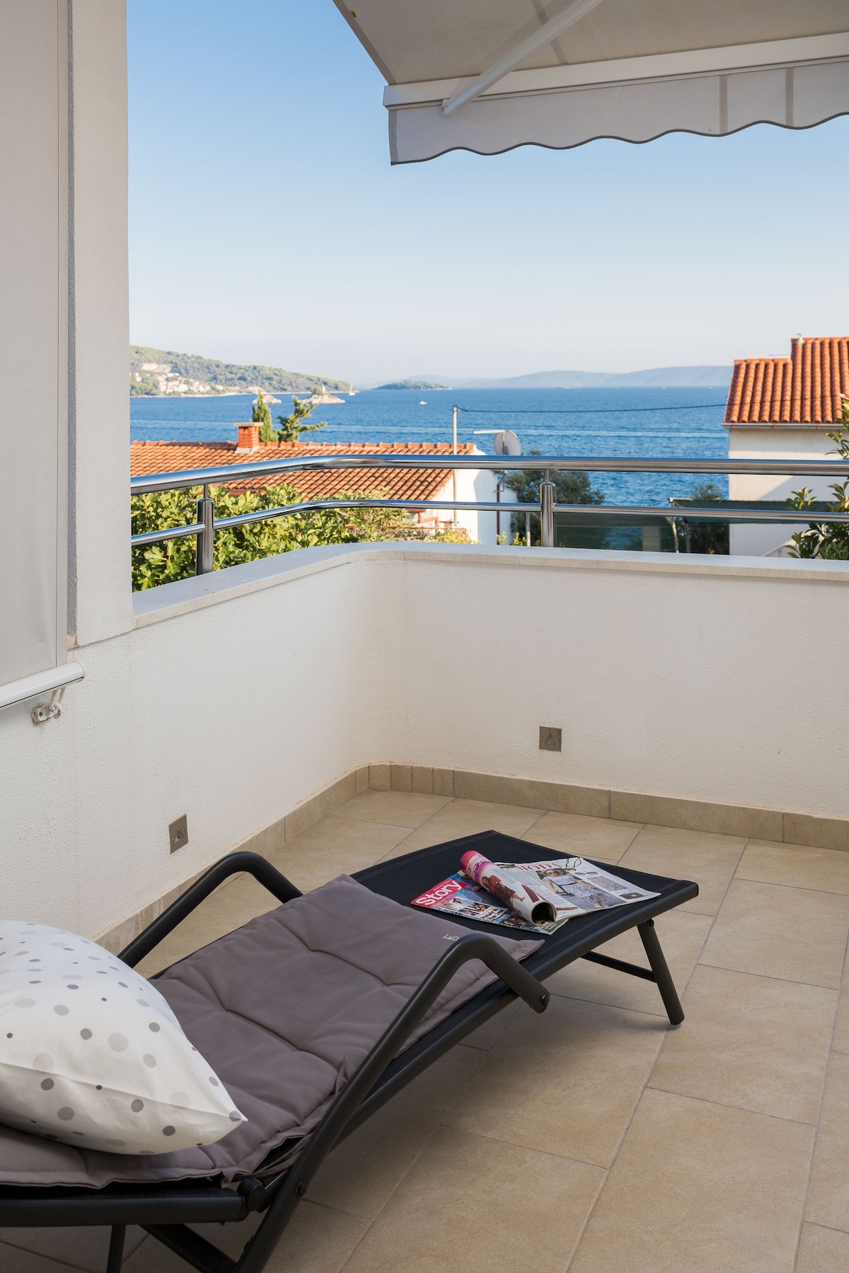 La habitación pequeña está ubicada en el último piso y ofrece bonitas vistas a la bahía de Trogir. Incluso puedes ver Split a lo lejos, con la montaña Mosor detrás. La habitación es perfecta para 2 personas. Otras características de la habitación son: cocina pequeña, aire acondicionado, 1 baño pequeño y un televisor inteligente de 43 pulgadas con Netflix, etc. Puedes ver directamente al mar mientras estás acostado en la cama (180 cm x 200 cm). El balcón tiene un tamaño agradable. Hay una mesa con 2 sillas y 1 tumbona para broncearse.