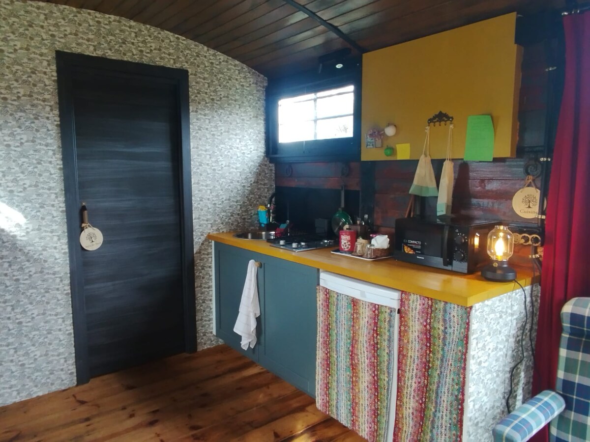 El Vagón Alegre comenzó su andadura en los años 50 y, algo cansado, decide jubilarse y establecerse en el monte, donde comienza un trabajo más liviano y apreciado por las personas que deciden habitarlo. Al subir las escaleras de hierro y correr la puerta, entramos en un espacio lleno de colores y fuerza proporcionada por el entorno de encinas y el aire puro en el que está inmerso. En la finca hay dos perros que conviven felizmente con los huéspedes al aire libre.