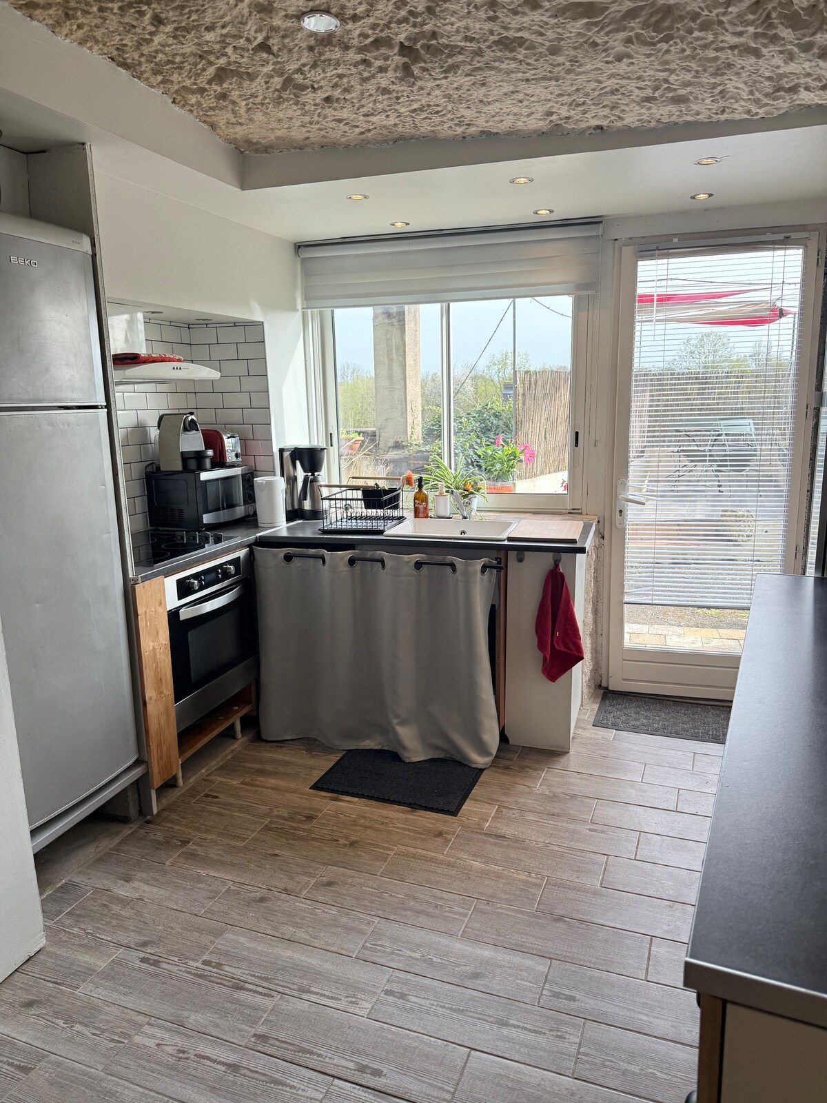 ¡Bienvenido a la Cueva del Moulin! Este loft natural está empotrado en un terrón de piedra caliza y le sorprenderá por su irregularidad. Consta de una gran cocina abierta a la sala de estar y un dormitorio con baño separado por una puerta de garaje corredera. En la habitación tiene una cama doble (160 cm) y en la sala de estar una cama individual (90 cm) con un sofá no convertible que puede servir como una pequeña cama una plaza.