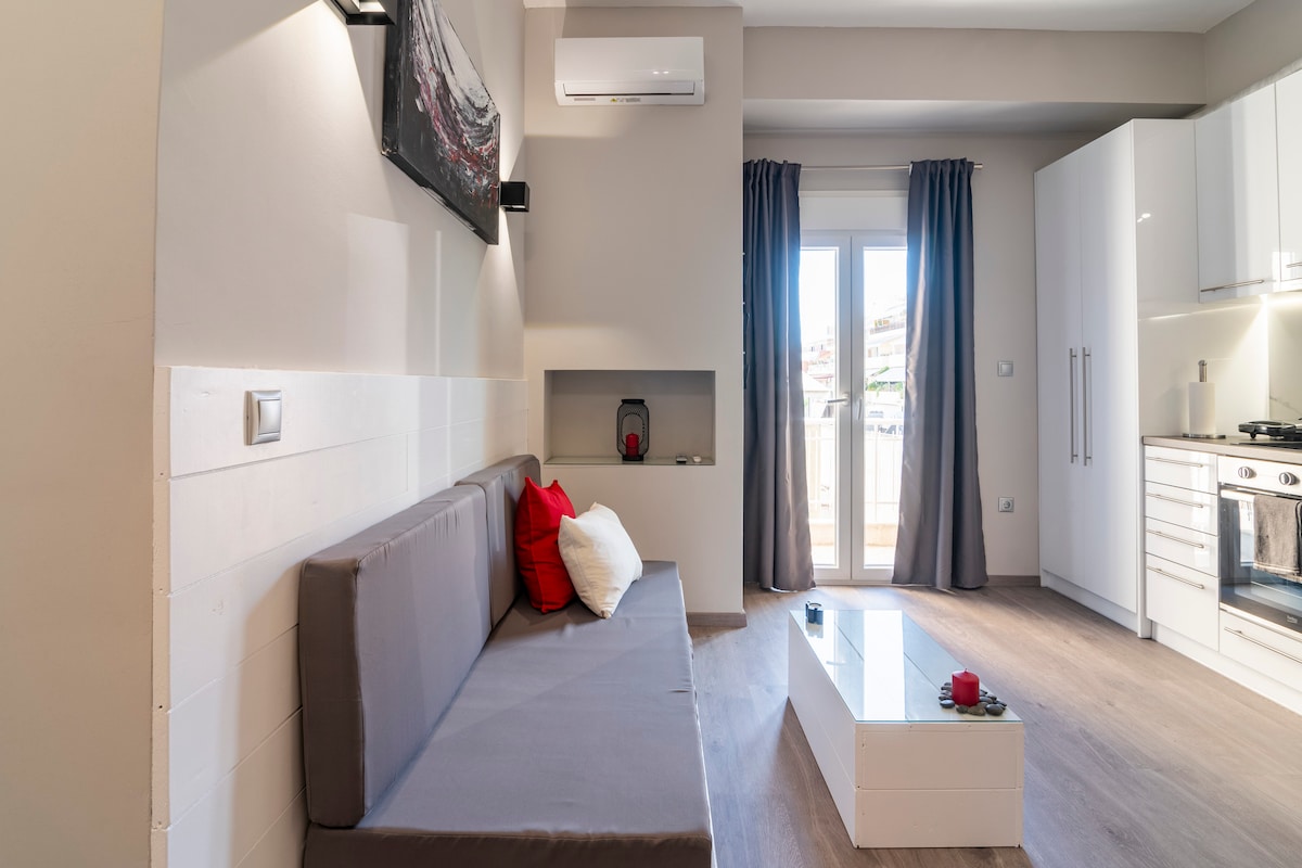 Este luminoso apartamento de un dormitorio cuenta con balcón y todas las comodidades modernas que necesitas para una estancia cómoda. Admira la decoración artística y moderna, explora una selección de libros sobre las islas griegas o sal a explorar las encantadoras calles sinuosas de la ciudad. El barrio es amable y lleno de vida local: a pocos pasos encontrarás un mercado de agricultores, restaurantes, cafeterías y un parque.