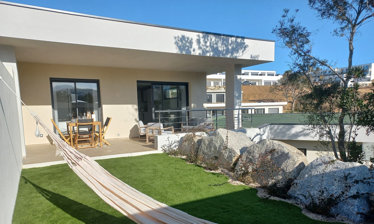 Bonito apartamento nuevo, tranquilo, en una pequeña zona a 2 minutos de las playas y de las tiendas. 46m2 totalmente decorados con el tema "BLANCO PURETE" que incluye: una cocina totalmente equipada (LV, Horno, ...), una sala de estar con gran sofá cama, una gran habitación con vestidor, baño con ducha a ras de suelo, terraza de 21 m2 y jardín de 30 m². Ideal para 4 personas. Se proporcionan ropa de cama de alta gama, sábanas y ropa de cama. Limpieza incluida. Acceso desde Ajaccio 20 min. aprox.