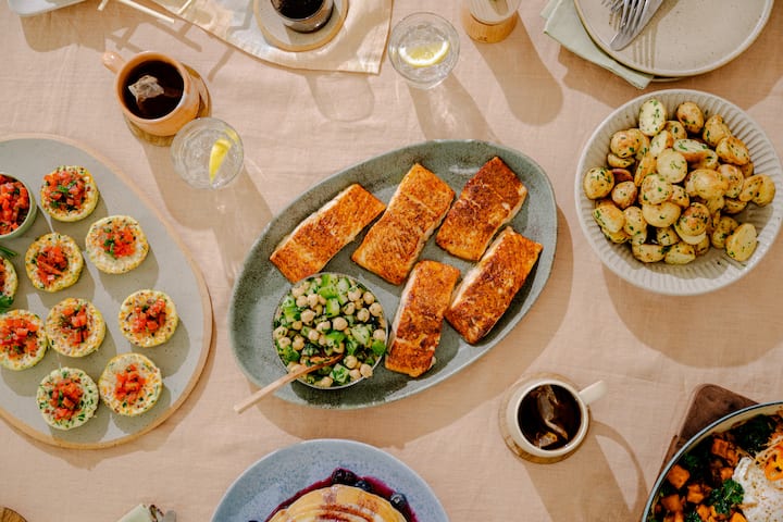 Cena con un menú de dos entrantes, un principal dulce y otro salado, y dos guarniciones.