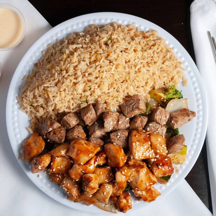 Incluye arroz frito, guarnición de verduras y ensalada