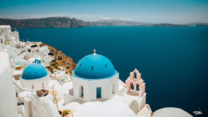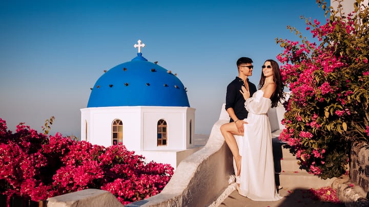 Captura tus momentos entre casas blancas, acantilados de caldera, mar azul profundo y la emblemática iglesia Blue Dome.