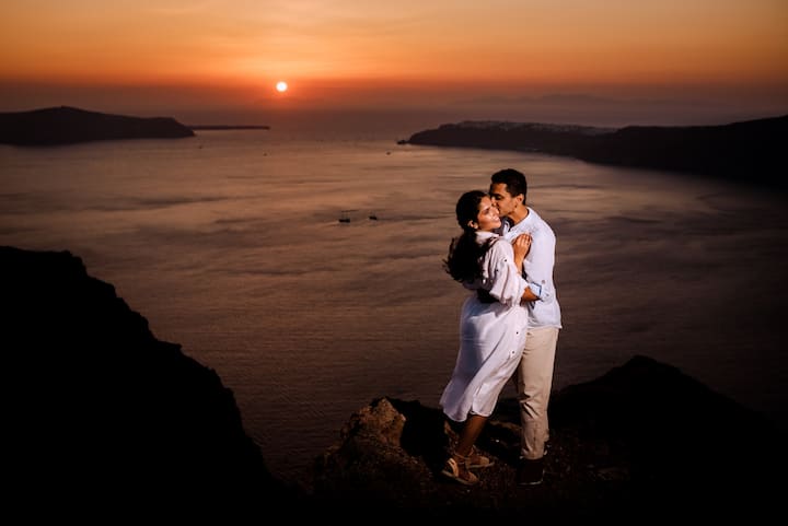 Incluye vestido volador, asistente y estudio privado para cambiarse. Dispara con el mar, acantilados, cúpulas y vistas al volcán.