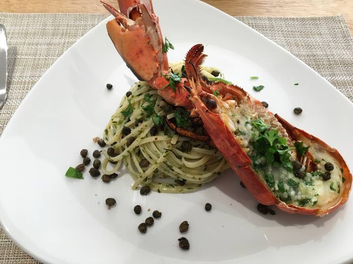 Principal: linguini con almejas o langosta fresca.