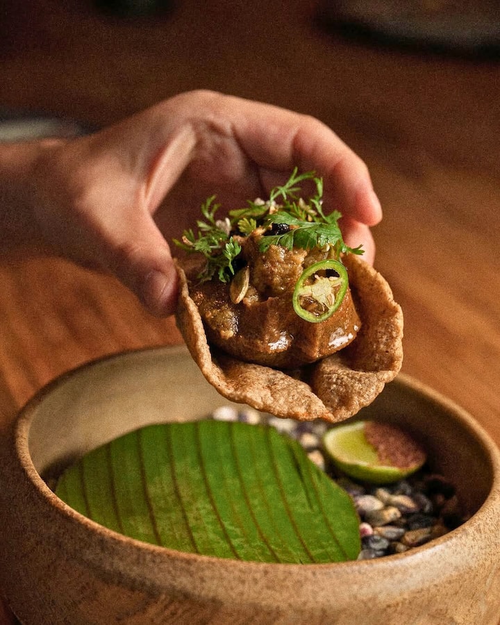 Este menú de 4 tiempos utiliza técnicas tradicionales, como la cocción subterránea simulada, e incorpora chaya, recadó negro y naranja agria. La propuesta acerca la cultura maya al comensal a través de recetas populares y preparaciones locales.