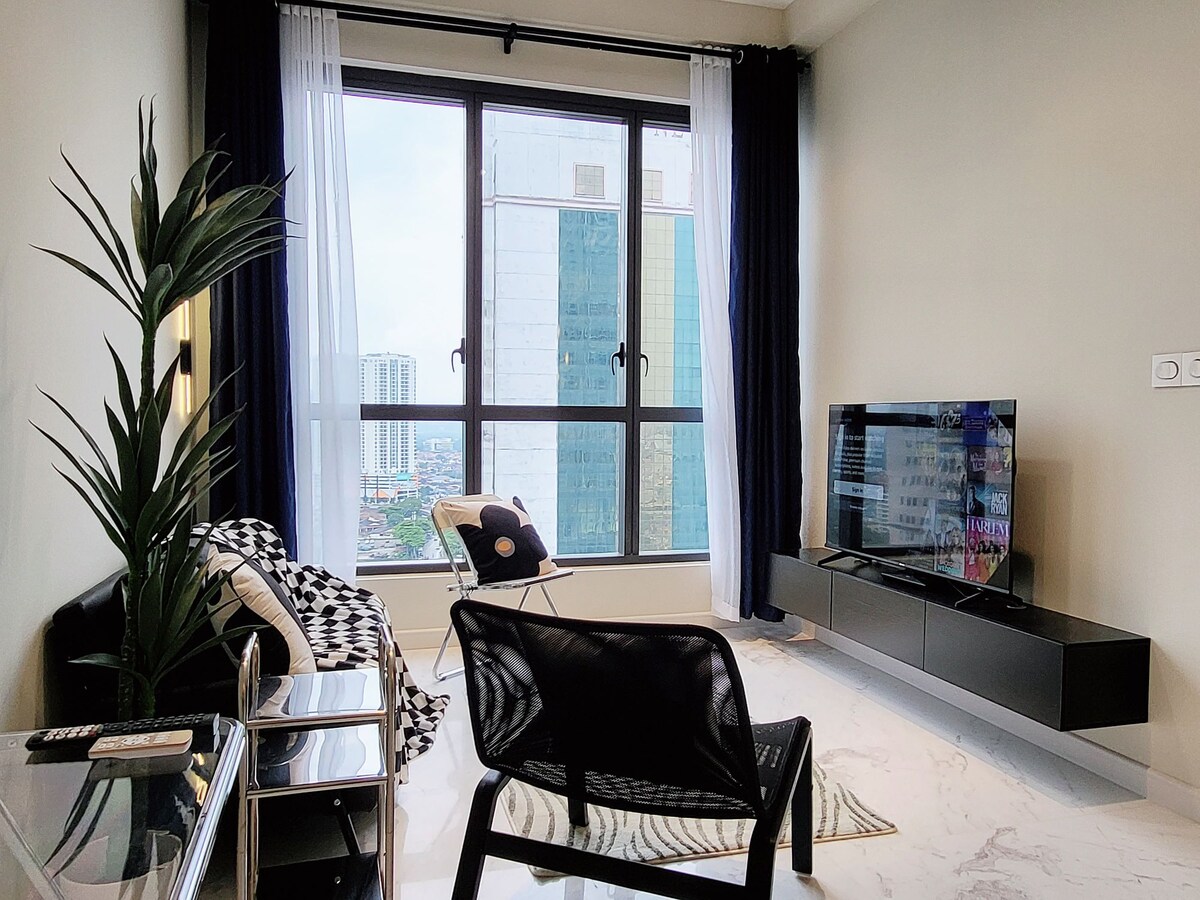(1+1 BR & 1 bathroom) Contemporary modern and cozy condo in the heart of JB city centre. Suitable for 4pax family, friends and business group. **5mins to CIQ, City Square, KSL, Pelangi, and Larkin **8mins to Mid Valley Southkey, Larkin Sentral and Sentosa **15 mins drive to Paradigm mall, Sutera, Skudai and Mount Austin ✔ 4K SmartTV ✔ High Speed Wi-Fi, working tables with extension plug ✔ Washer ✔ Airconds in every rooms. ✔ Atari console, Mahjong, and Board games. ✔ FREE parking for 1 car