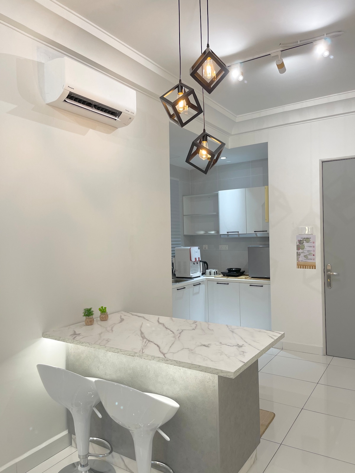 Un NUEVO y elegante diseño MUJI, un estudio acogedor y espacioso ubicado en un apartamento de lujo en Johor Bahru, D' Secret Garden @ Kempas Indah. A 3 minutos en coche de Kempas Plaza Toll. A 15 minutos en coche de CIQ/Singapur a través de EDL y a 25 minutos del aeropuerto de Senai. Es un lugar perfecto para estancias familiares o viajes de negocios con fácil acceso a todas las zonas de JB. El condominio DSG ofrece instalaciones que rejuvenecerán tu cuerpo, mente y alma cansados, como piscina infinita, jacuzzi, gimnasio, putting greens de golf y parque infantil.