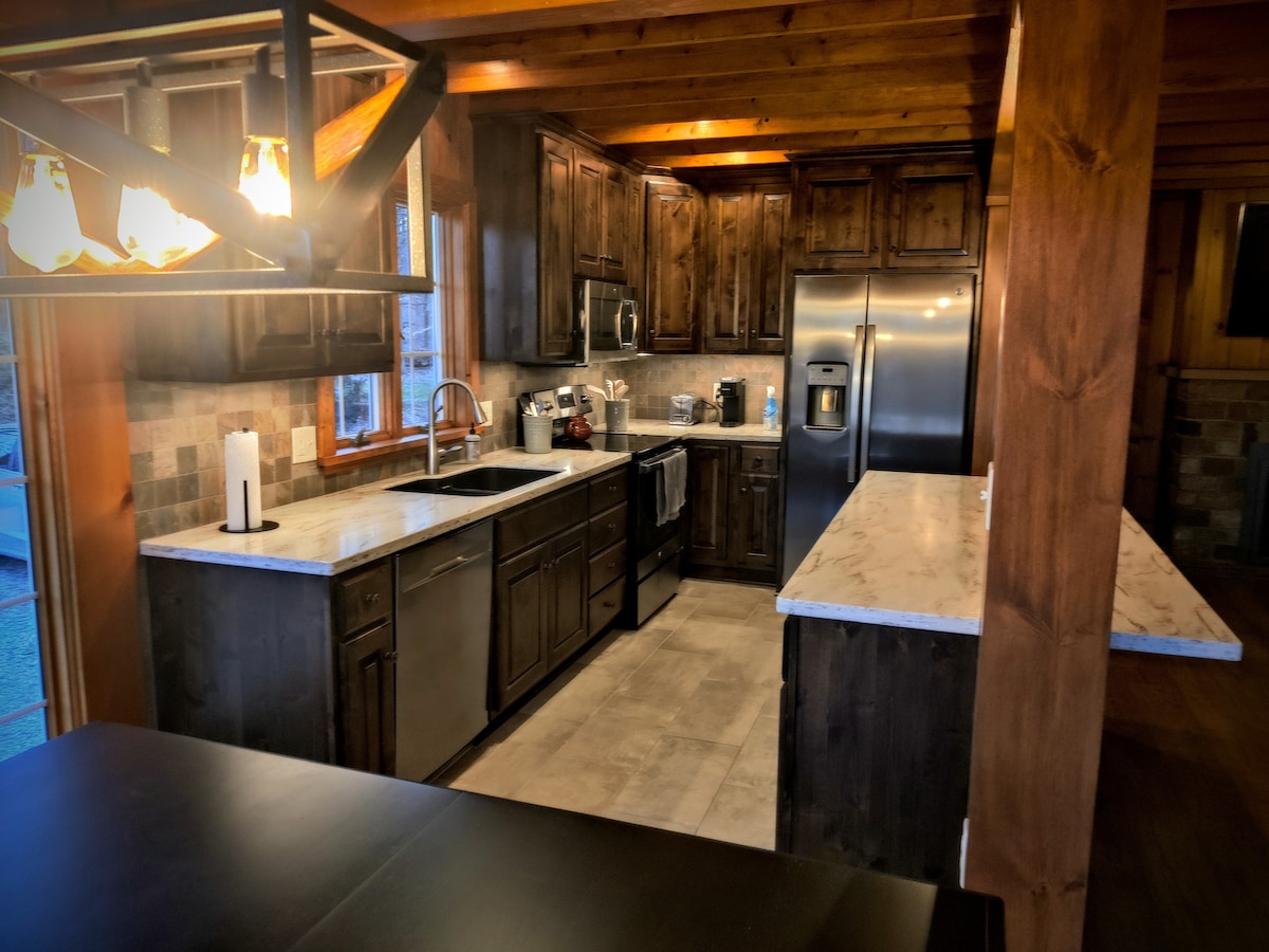 Relax with the whole family at this peaceful place to stay. Cabin sits on 4 acreas of hill and wooded areas. Main guest area has many new updates including new kitchen, new master bath, updated main bath with tankless hot water heater, new floors, lighting, window blinds, and gas fireplace. 4 Bedrooms feature 1 King Size Bed, 2 Queen Size Beds, and 2 twin air mattress