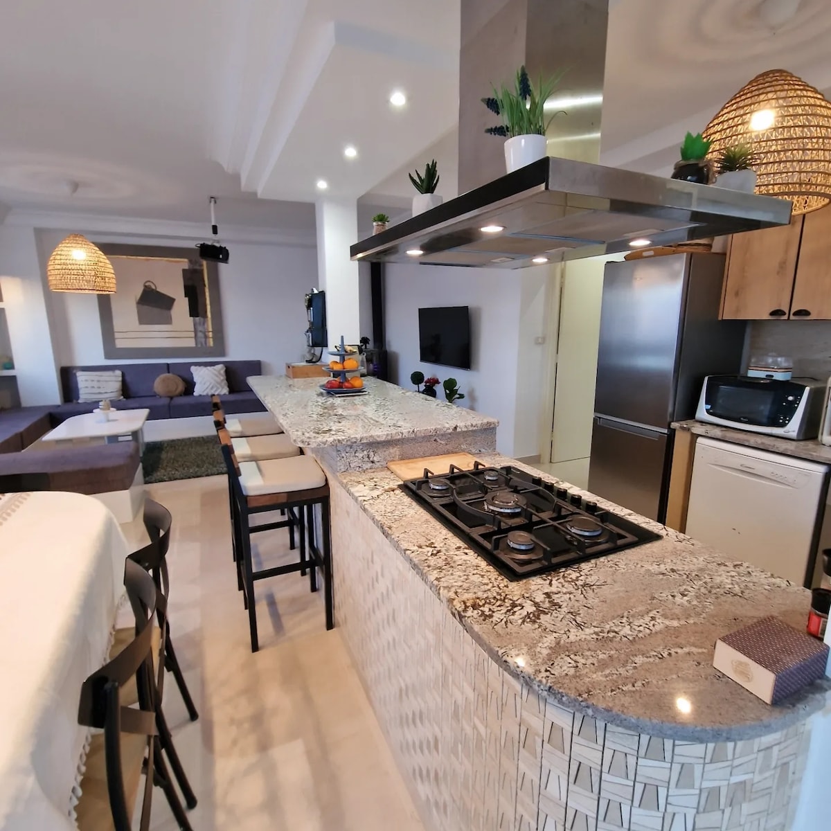 Villa de lujo y amueblada situada en sfax a 4 km del centro de la ciudad en una zona tranquila y elegante. consta de 3 habitaciones, 2 salones con aire acondicionado , una cocina y una zona de comedor. con una amplia terraza y garaje para el coche