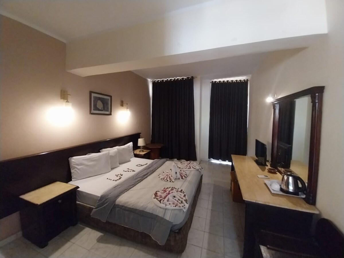 Acogedora y privada habitación de hotel con cama tamaño king. Situado en la planta baja con una bonita terraza con vistas al jardín. Acqua Marine Beach Hotel. El hotel forma parte de un enorme complejo que contiene varios hoteles, villas privadas, apartamentos, estudios y alojamientos compartidos llamados Domina Coral Bay. administrado por una administración italiana profesional 5*****