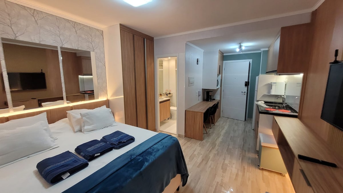 Un refugio moderno, cómodo y enérgico en el corazón de Tatuapé, a solo unos pasos del metro y de los centros comerciales Boulevard y Tatuapé. El estudio cuenta con un diseño de 24 m² (24 metros cuadrados) con una cama doble súper cómoda, cortinas opacas, aire acondicionado, un televisor inteligente de 55 pulgadas, wifi rápido, una cocina totalmente equipada (nevera, estufa, microondas, utensilios y café para comenzar el día bien), además de ropa de cama, toallas y artículos de tocador básicos.