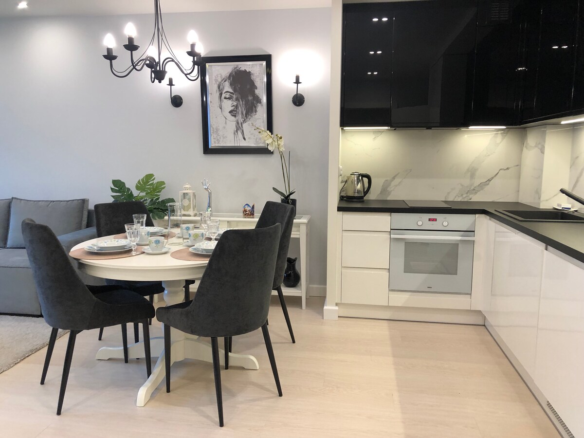 Apartamento elegante y espacioso en un nuevo apartamento Baltic Marina Residence para 4 personas. Aproximadamente 48 m2 incluyen un dormitorio con cerradura con una cama matrimonial de 140x200 cm, una sala de estar con una esquina plegable, un comedor, una cocina americana totalmente equipada y un baño con ducha. El departamento tiene acceso a un balcón.