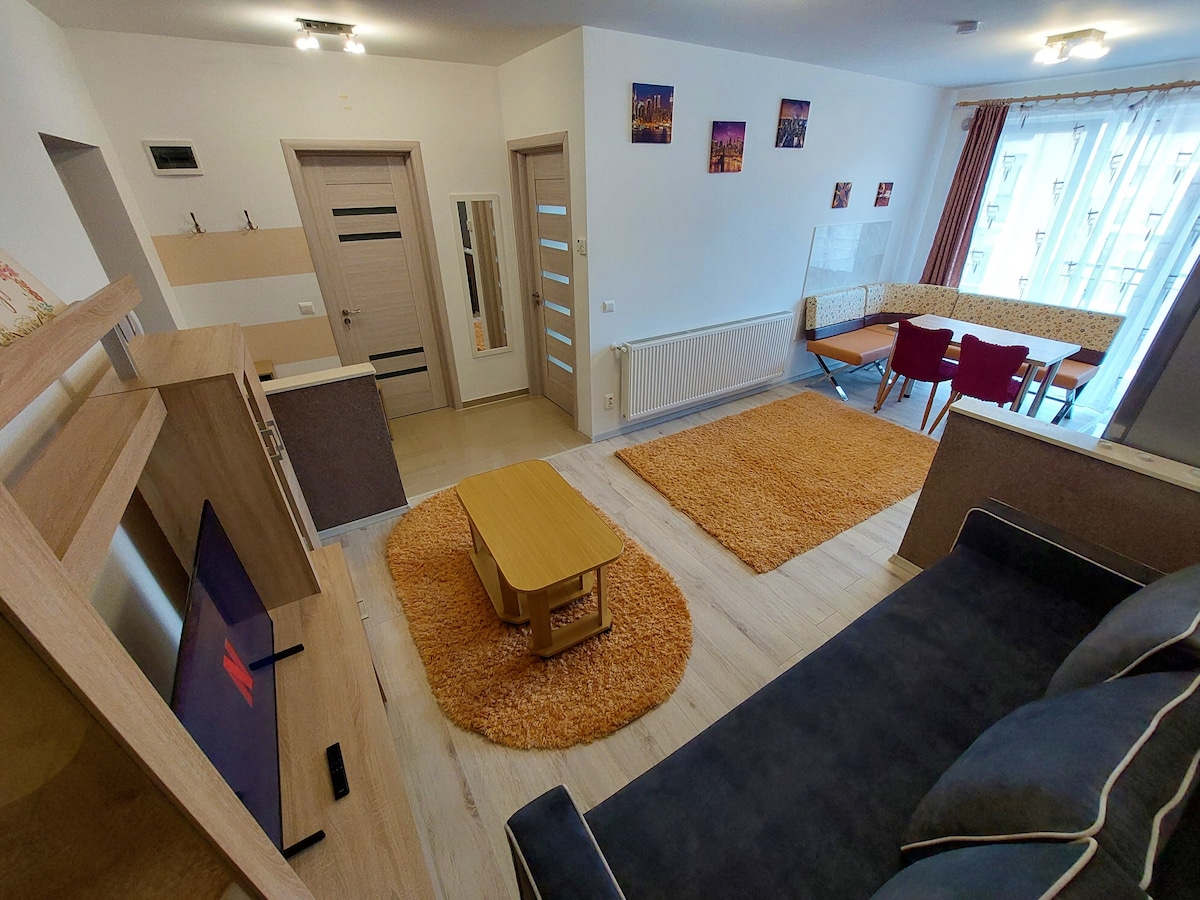 Nuestro departamento está a pocos pasos de Piata Mare (Grand Square) en Sibiu. Ubicado en un edificio histórico de 200 años de antigüedad, cuenta con un acogedor dormitorio, sala de estar con TV inteligente (Netflix), wifi rápido y cocina totalmente equipada con cafetera, estufa y lavadora. La calefacción central mantiene las cosas calientes en invierno y el aire acondicionado está disponible durante el verano. Una pequeña terraza privada agrega encanto adicional, perfecta para relajarse después de un día explorando la ciudad.