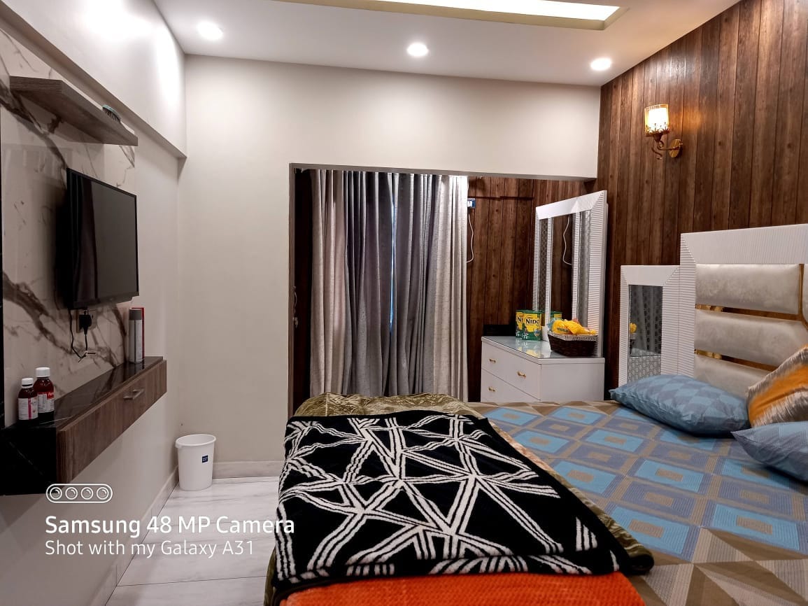 Entire Apartment with AC, WiFi, and Smart LED TV Your private, secure oasis awaits! This cozy, fully furnished apt is perfect for a peaceful getaway. Featuring a spacious bedroom with a king-size bed, wardrobe, dressing mirror, and Android LED TV, The attached bathroom includes a commode, shower, and wash basin, enough for a relaxing stay The kitchen is equipped with a refrigerator, microwave, and a dining space for two, making it easy to enjoy home-cooked meals. A second room with a small bed