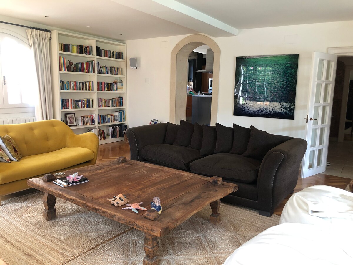 ¿Buscas una Barcelona diferente? ¿Quieres un ambiente tranquilo, rodeado de árboles y flores, despertar con el canto de los pájaros? A 12 minutos en tren de la plaza Cataluña y Ramblas, a dos minutos andando del Parque Natural de Collserola. Con chimenea, hidromasaje, piscina y todo lo necesario para que te sientas como en casa. Ideal para familias con 2 o 3 hijos. (Codigo de inscripción HUTB-013201-08). Se aparca bien en la calle de encima, es gratuito y el coche estará seguro.
